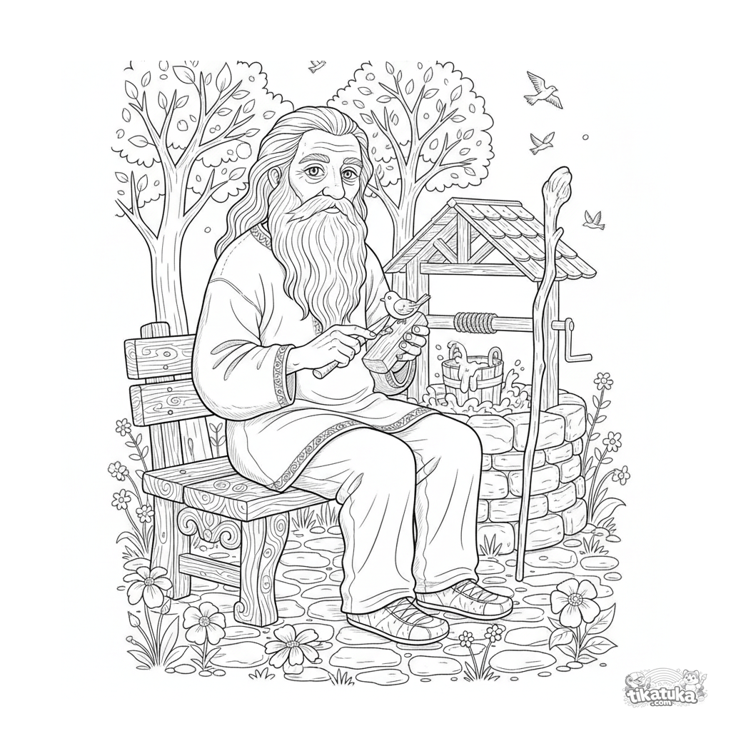Página para colorir para crianças 10-12: um ancião guardião sentado ao lado do poço de água viva entalhando uma figura. Cena detalhada em estilo de gravura vintage.