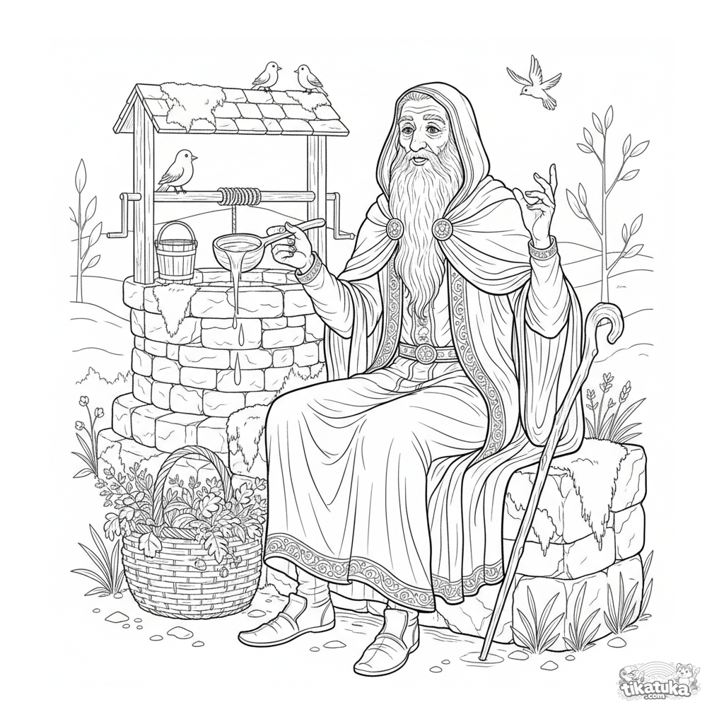 Página para colorir para crianças maiores 10-12: um sábio contador de histórias num poço de água viva. Estilo de gravura detalhado, cena centralizada.