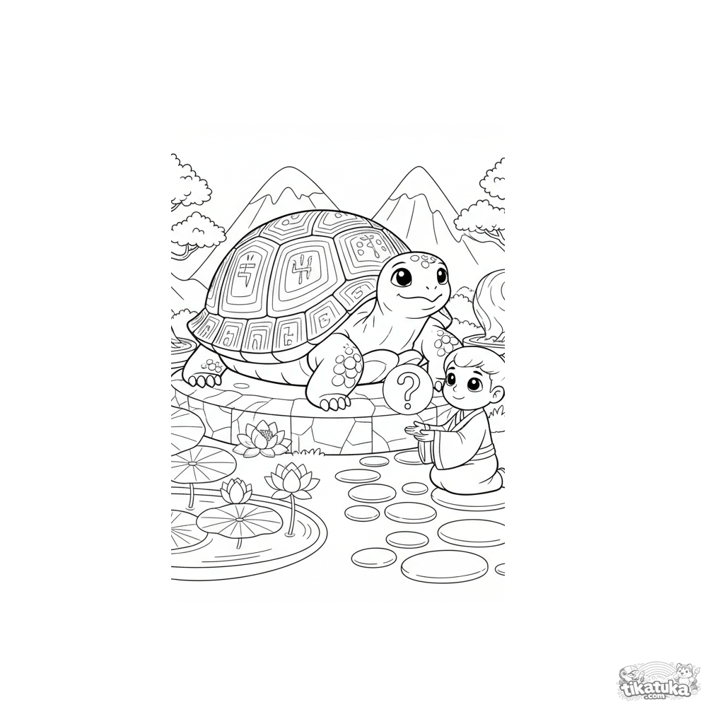 Página para colorir para crianças mais velhas: uma sábia tartaruga oráculo dá conselhos a um acólito em um jardim de templo da montanha. Cena de enigma detalhada de mitos.