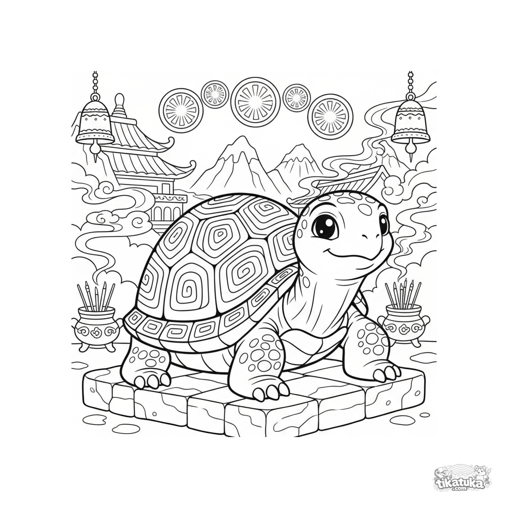 Página para colorir para crianças: uma tartaruga sábia antiga senta-se em um templo da montanha, encontrando-se com deuses representados como orbes brilhantes, com queimadores de incenso e sinos ao redor.