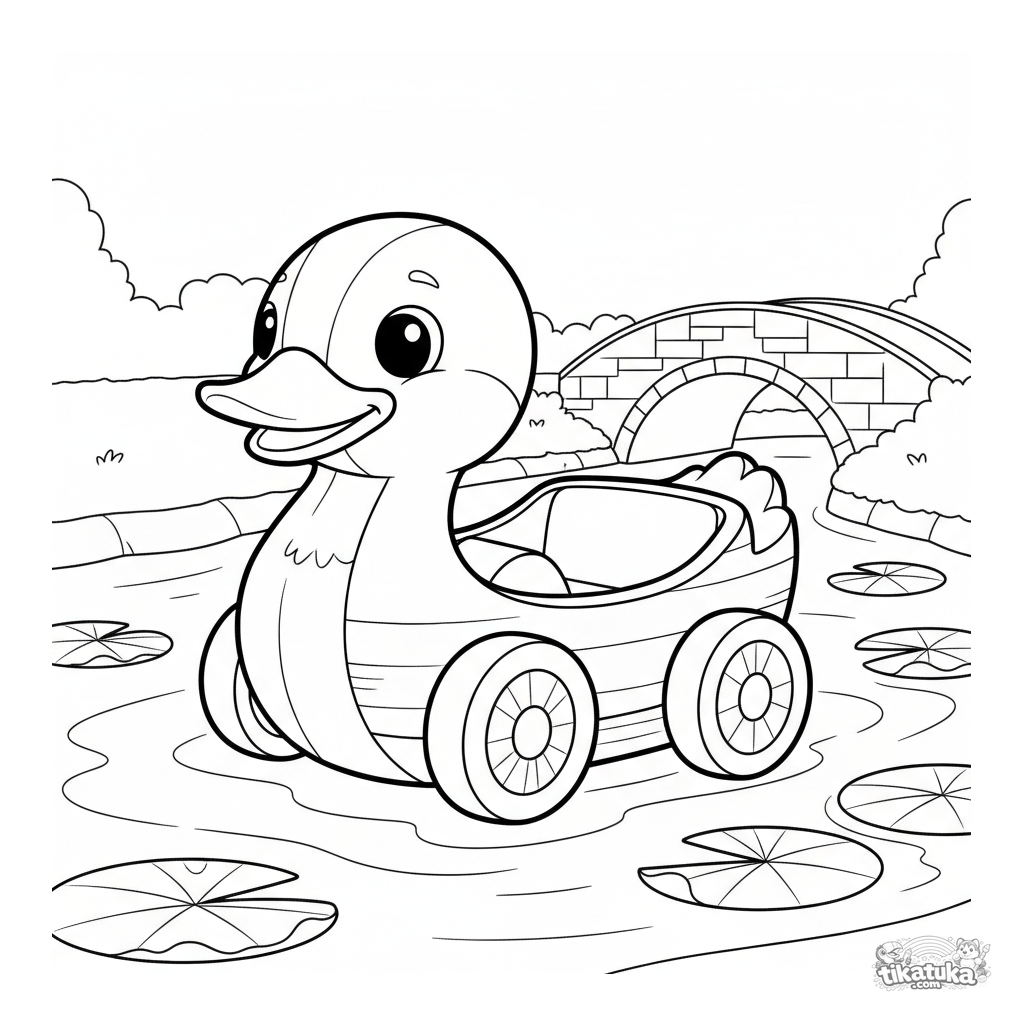 Página para colorir para crianças pequenas: um barco a pedal em forma de pato alegre em um lago tranquilo. Formas simples e margens amplas.