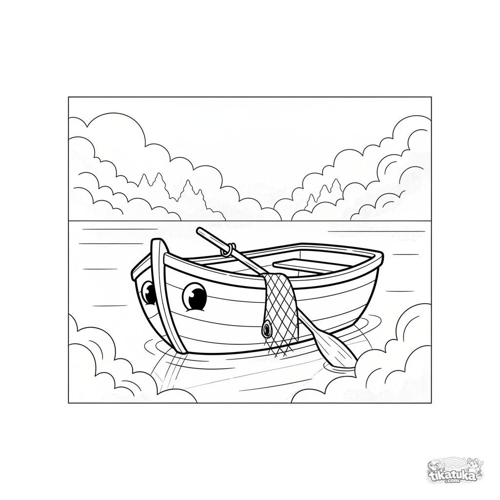 Página para colorir para crianças 4-6: um barco de pesca de madeira flutua na névoa matinal de um lago calmo. Formas simples, cena clara.