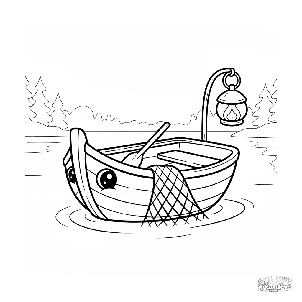 Página para colorir para crianças pequenas: um barco de pesca de madeira simples em um lago calmo e enevoado. Formas grandes, detalhes mínimos.