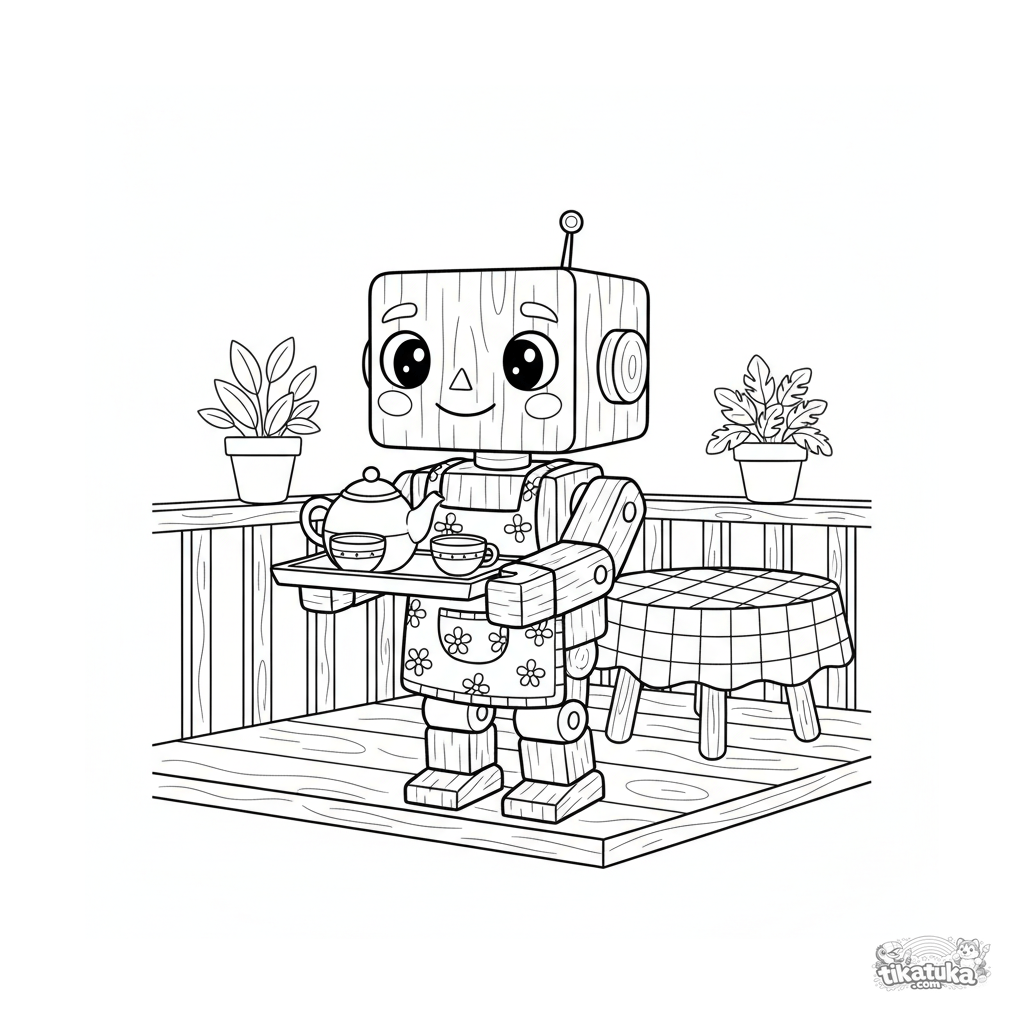 Página para colorir para crianças de 7-9 anos: um robô de brinquedo de madeira serve chá numa bandeja na varanda. Cena divertida e aconchegante.