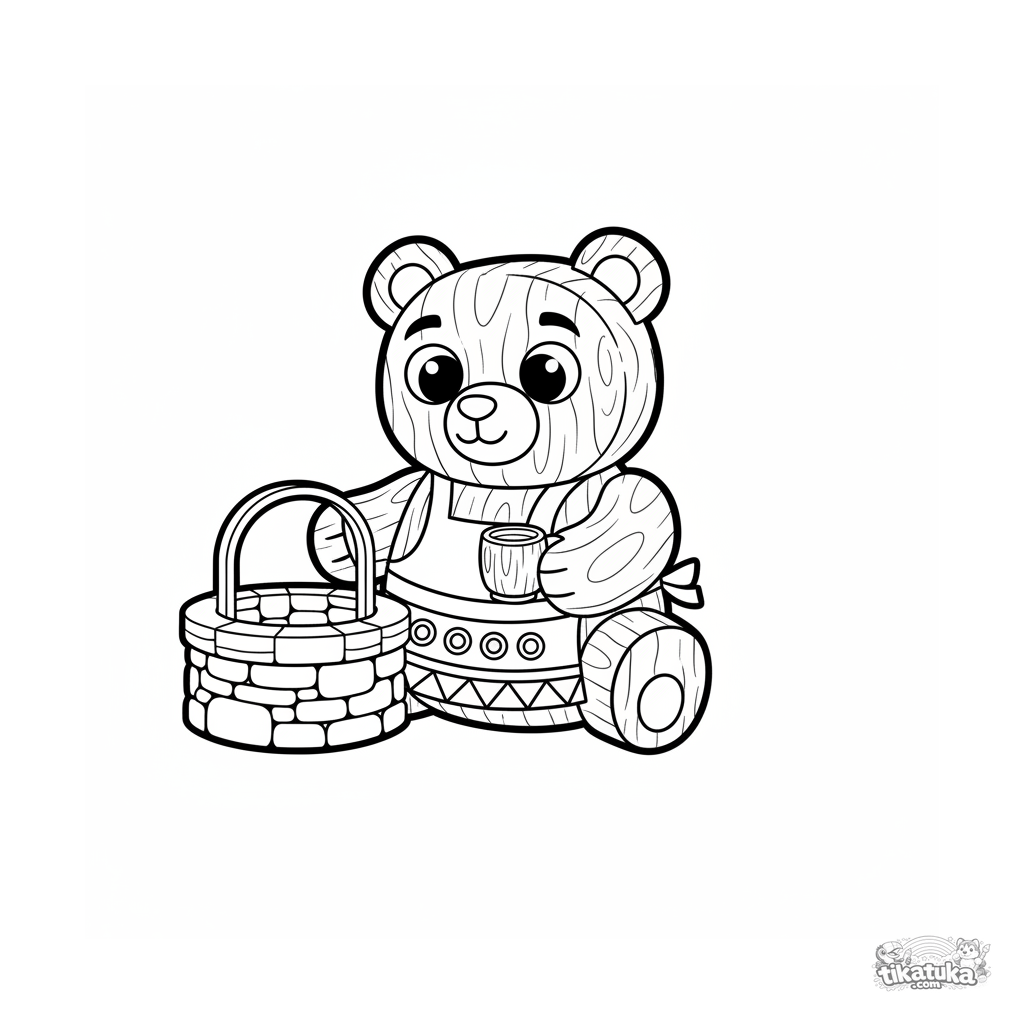 Página simples para colorir para bebês 2-3: um urso guardião de madeira amigável sentado ao lado do poço de água viva. Formas grandes, poucos detalhes, perfeito para primeiros lápis.