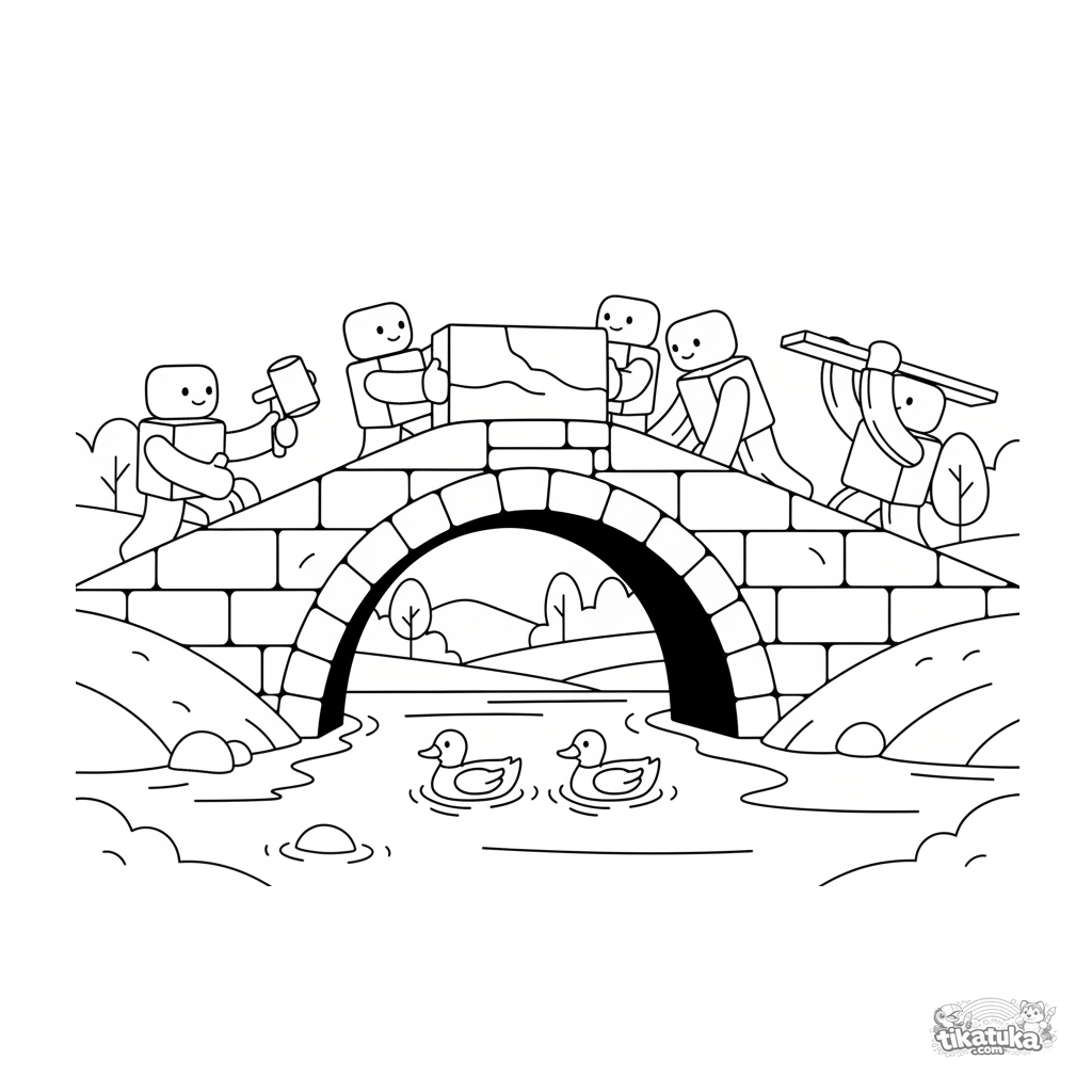 Página para colorir para crianças de 4-6 anos: construtores de brinquedo terminam uma ponte de pedra sobre um rio. Formas geométricas simples e uma cena divertida.