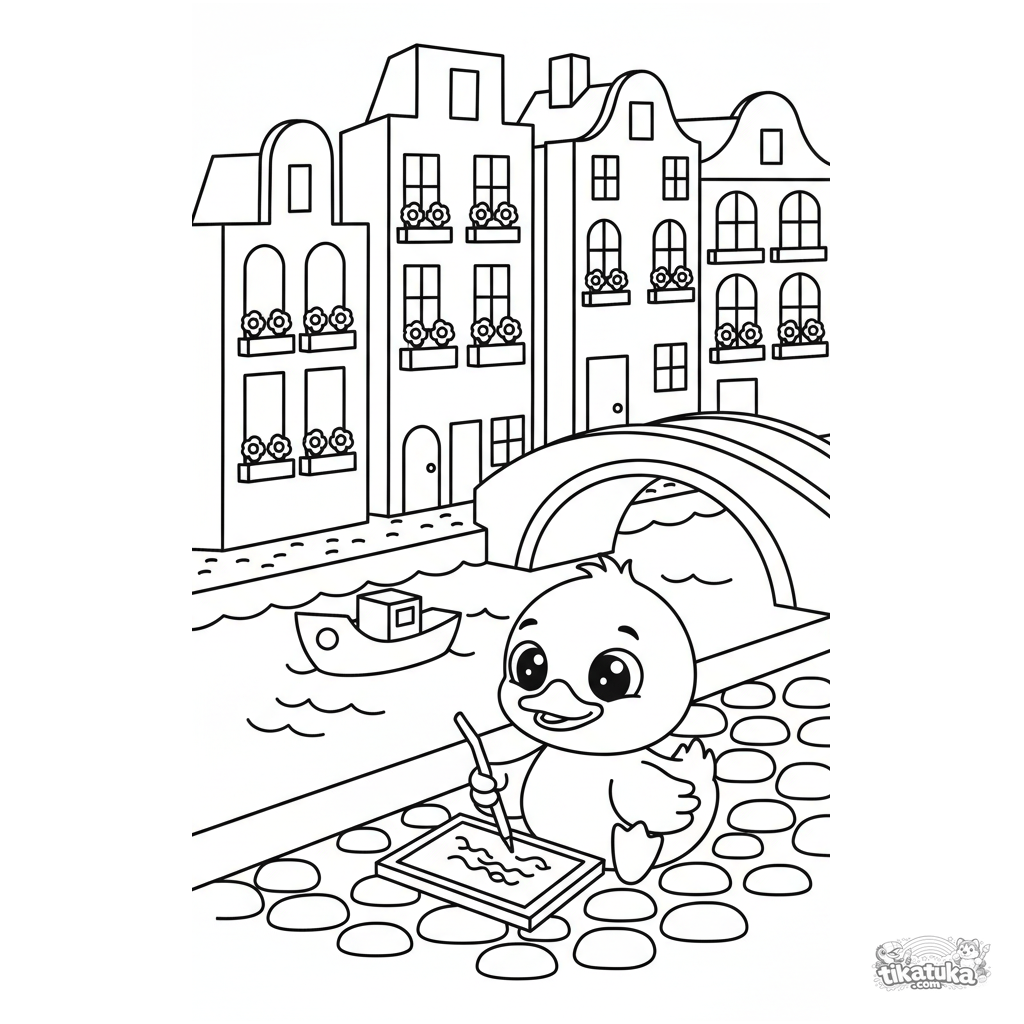 Página para colorir para crianças pequenas 2-3: uma rua aconchegante com canal e casas, um patinho desenhando com giz. Formas grandes e simples como brinquedo de madeira, margens muito amplas.