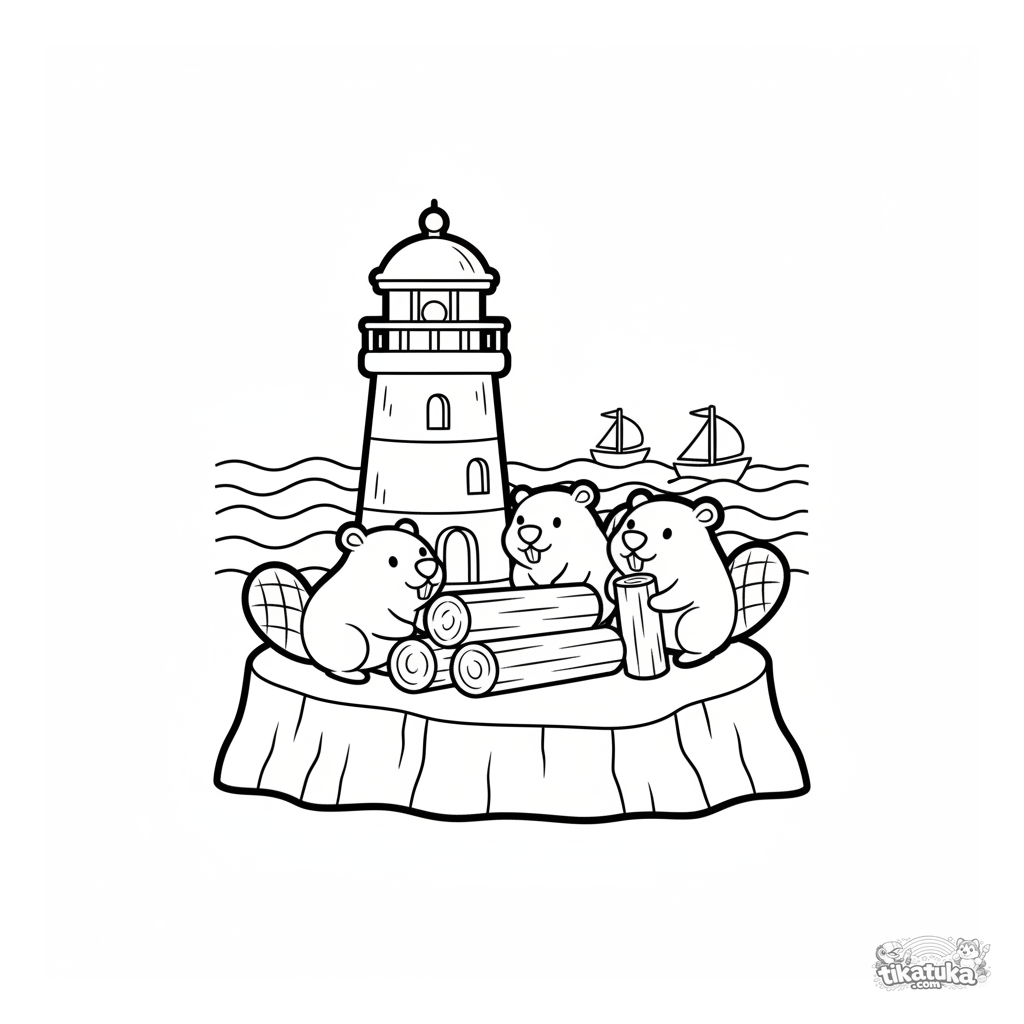 Página para colorir para crianças pequenas 2-3: um farol simples em um penhasco, castores construindo uma represa em sua base. Formas grandes como brinquedos de madeira, margens muito amplas.