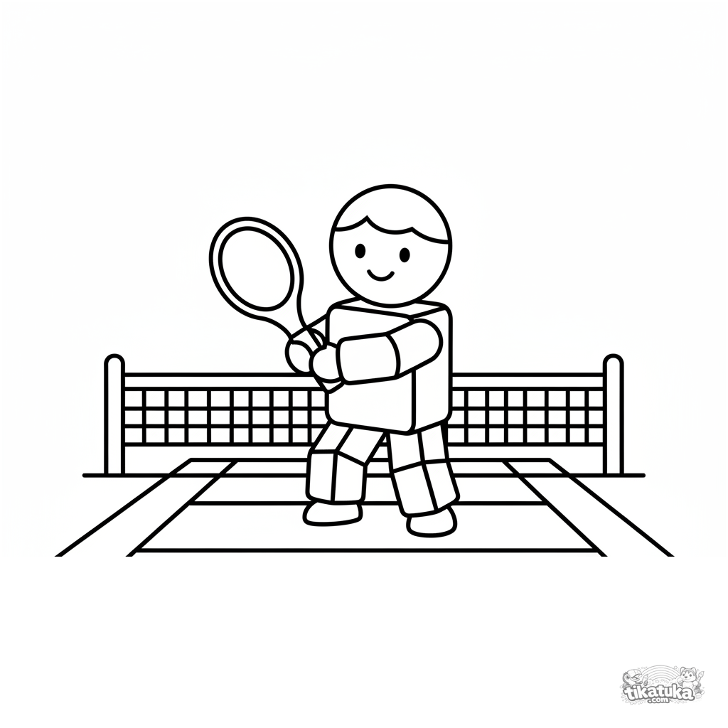 Página muito simples para colorir para bebês de 2-3 anos: um brinquedo de madeira de tenista em uma quadra com rede. Formas geométricas grandes.