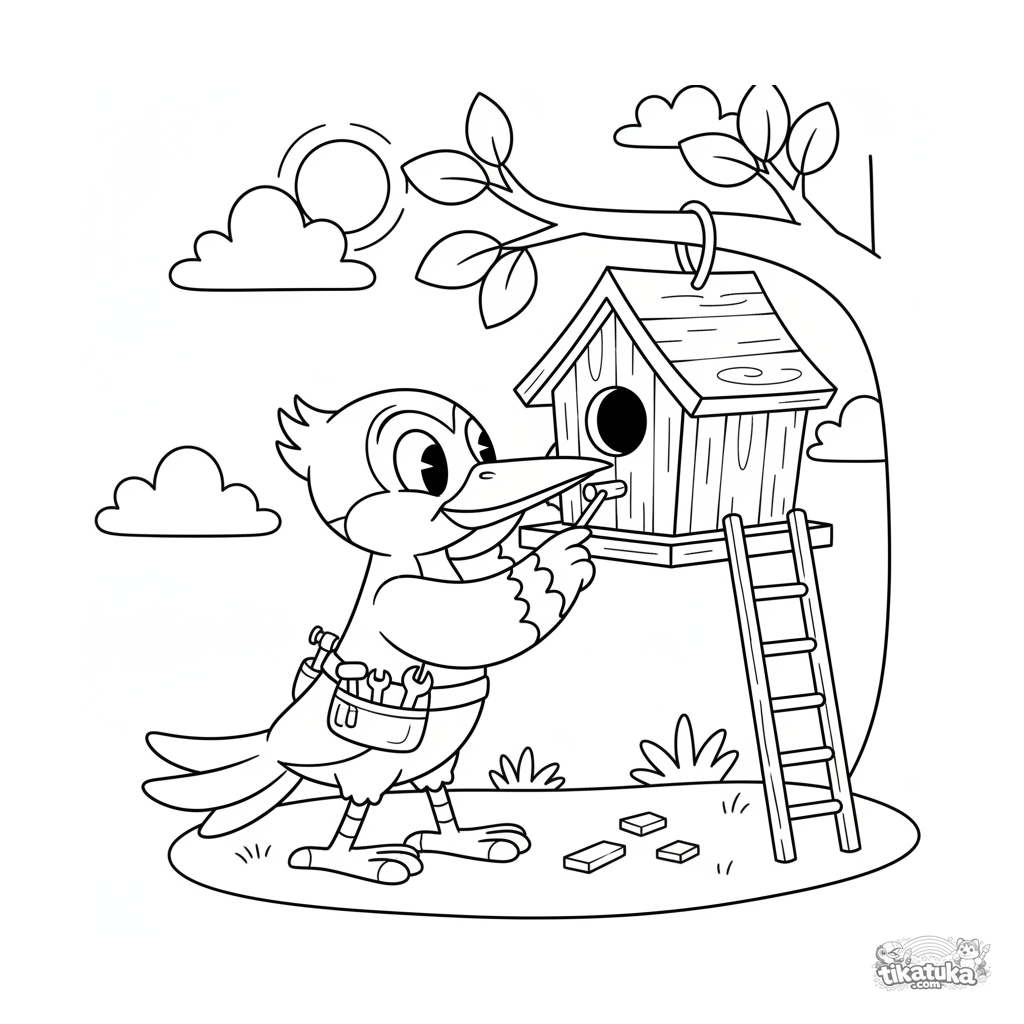 Página para colorir para crianças 4-6: um pica-pau alegre em estilo retro inspeciona uma casa de pássaros de madeira. Com cinto de ferramentas e escada por perto.