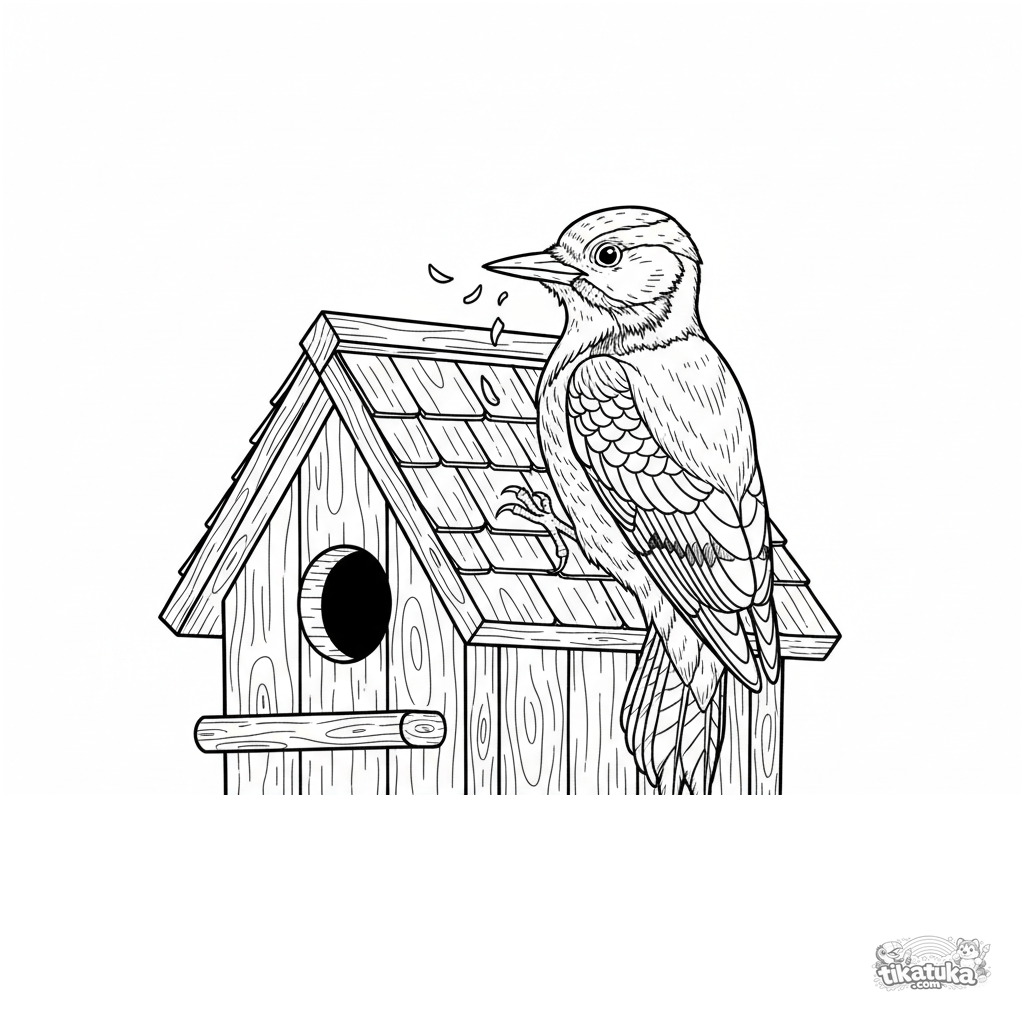 Página para colorir para crianças mais velhas 10-12: um pica-pau em estilo de guia de campo batendo no telhado de um ninho de pássaros de madeira na beira da floresta. Ilustração naturalista detalhada.