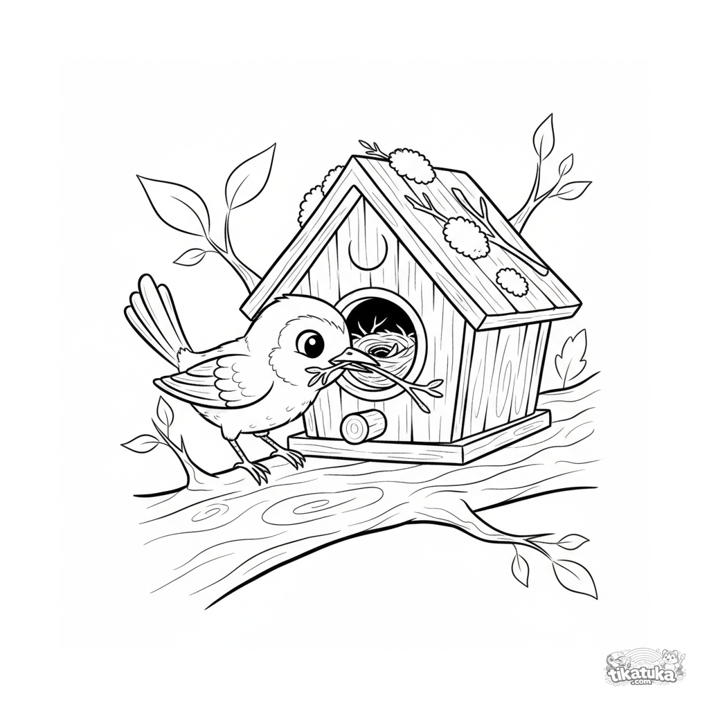 Página para colorir para 7-9 anos: uma pequena carriça carrega um graveto para seu ninho em uma casa de pássaros de madeira. Estilo solto de esboço de aquarela, pose expressiva.