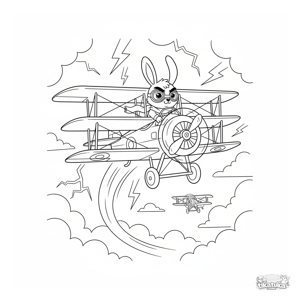 Página para colorir para 7-9 anos: um triplano da Primeira Guerra Mundial faz um loop em um céu tempestuoso. Cena de ação dinâmica.