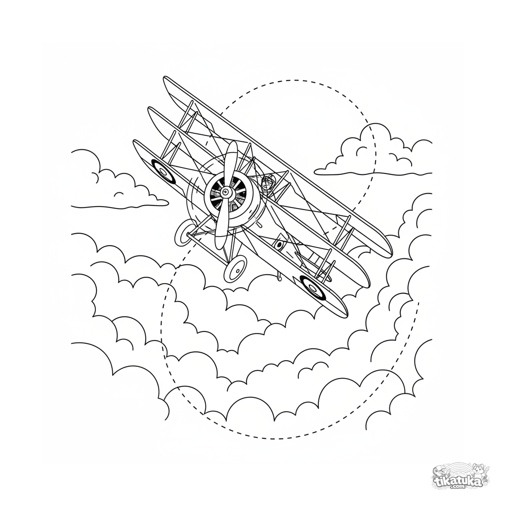 Página para colorir de um triplano histórico executando um looping acrobático nas nuvens. Para crianças de 4 a 6 anos. Detalhes claros, pose dinâmica.