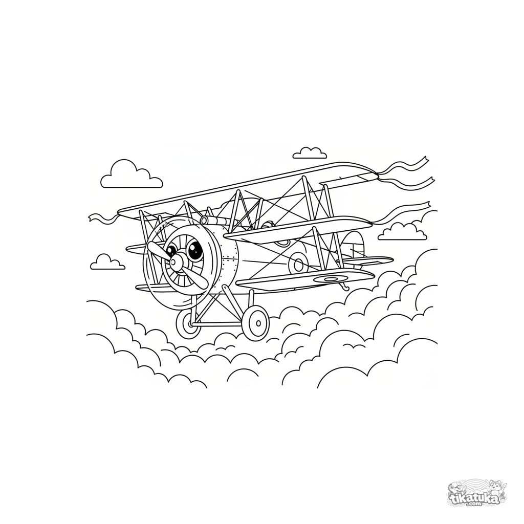 Página para colorir para crianças de 7-9 anos: um triplano da Primeira Guerra Mundial fazendo uma curva dinâmica nas nuvens. Estilo de quadrinhos de aventura.