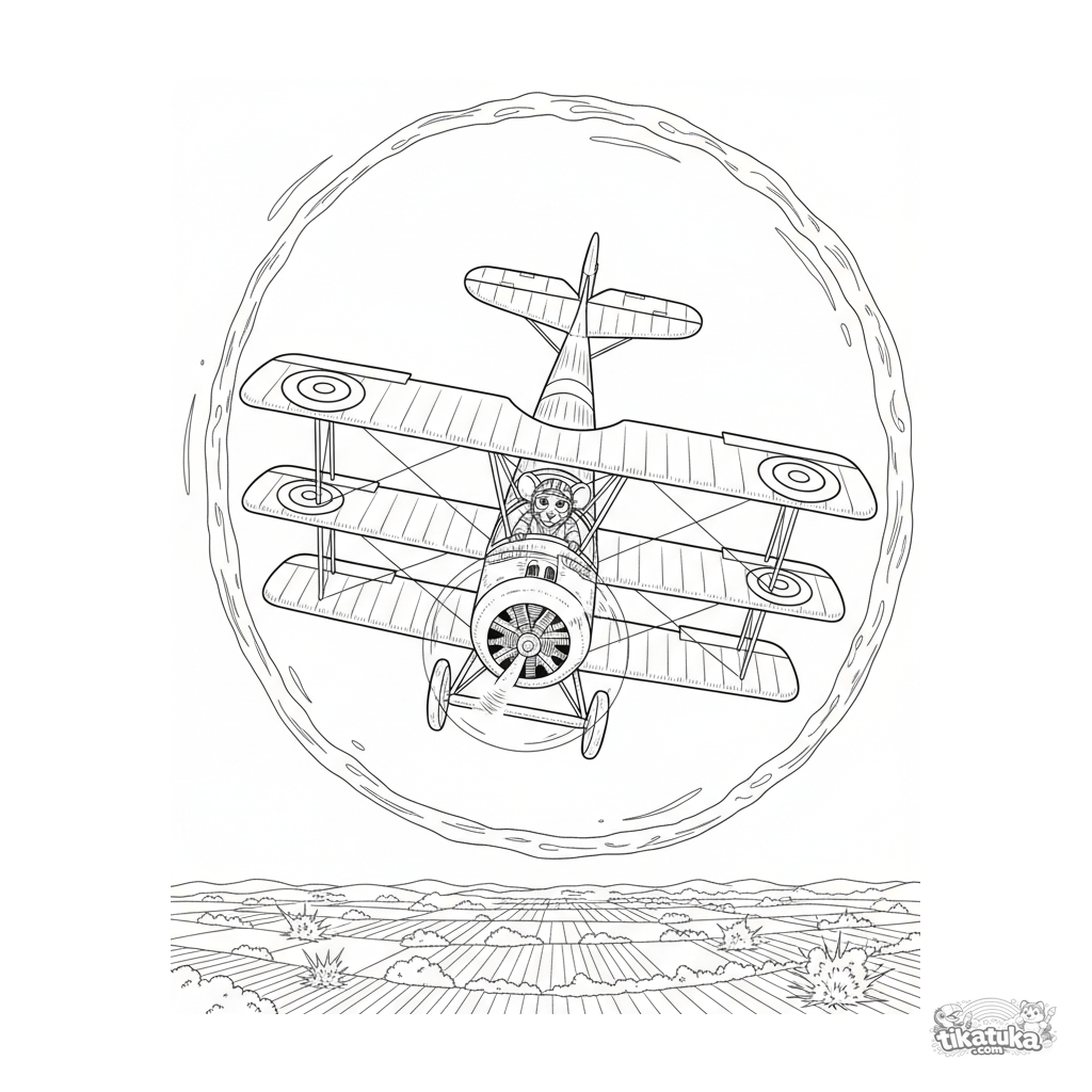 Página complexa para colorir para crianças de 10-12 anos: um triplano da Primeira Guerra Mundial executa um loop sobre um campo de batalha. Trabalho de linha detalhado, piloto rato no cockpit.
