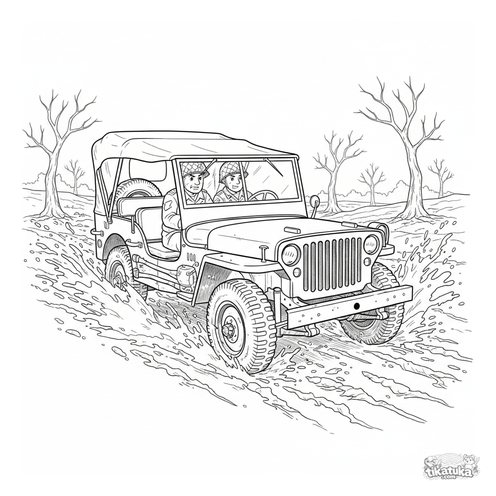 Página para colorir detalhada de um jipe militar da Segunda Guerra Mundial dirigindo por um campo lamacento. Para meninos de 7 a 12 anos. Apresenta respingos de lama, um pneu sobressalente e um motorista soldado.