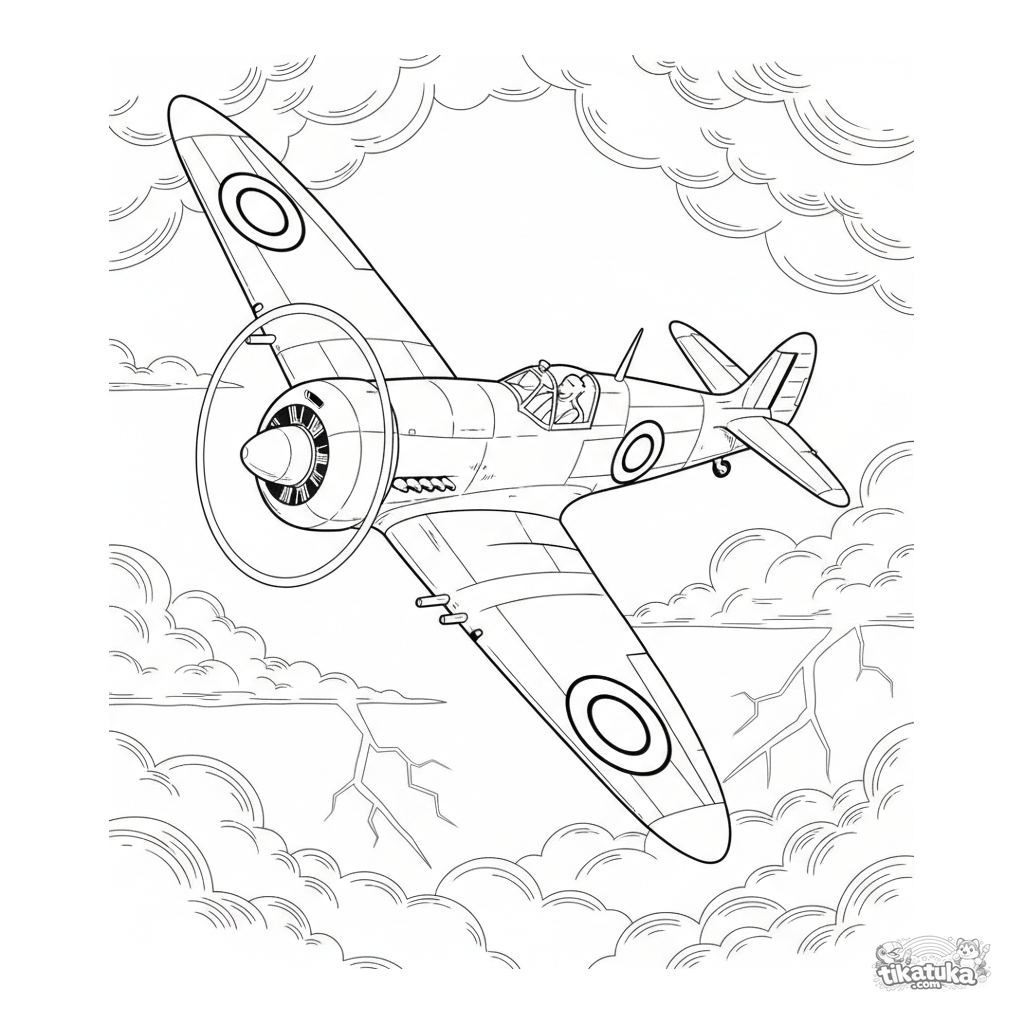 Página para colorir para crianças mais velhas 10-12: um avião de caça vintage da Segunda Guerra Mundial realiza um loop em um céu tempestuoso.