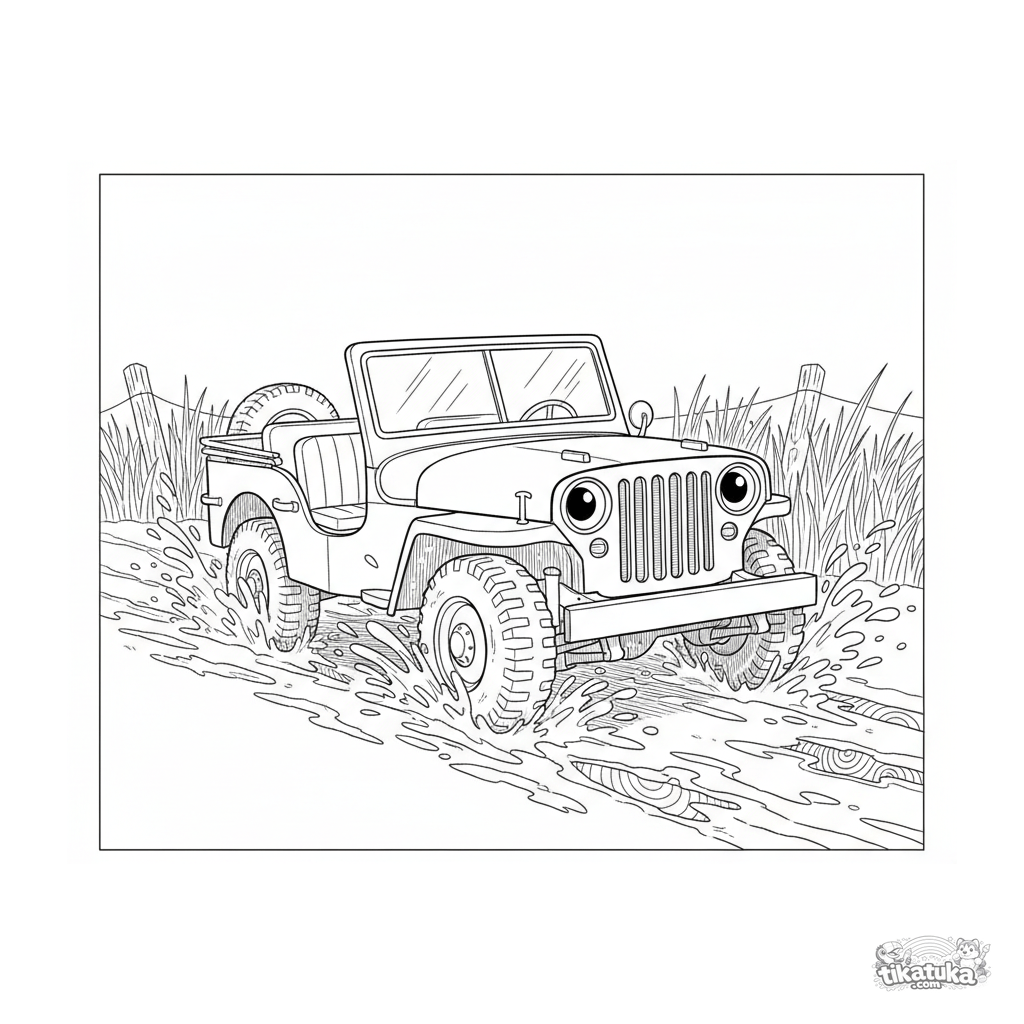 Página para colorir de um jipe militar da Segunda Guerra Mundial. Para meninos de 7 a 12 anos. O veículo está dirigindo por um campo lamacento, espirrando água e lama.