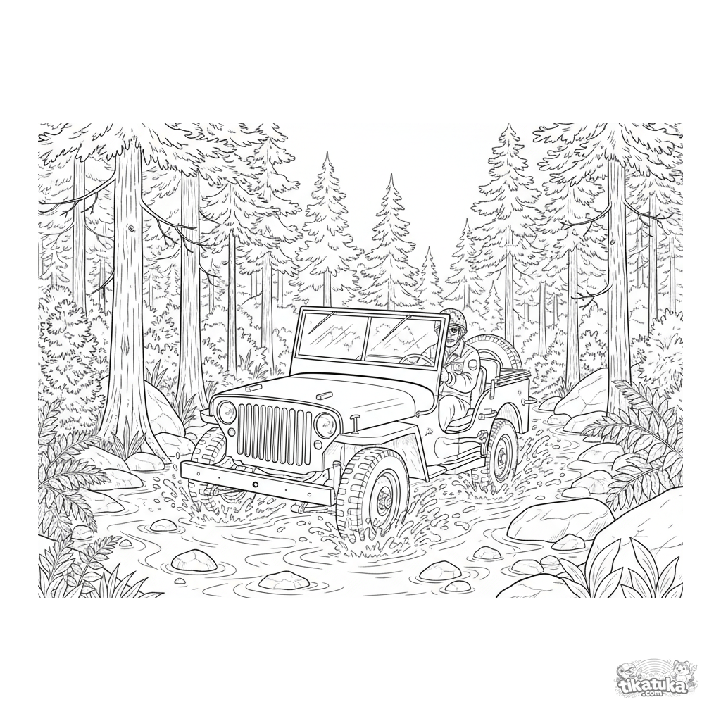 Página para colorir para meninos 7-12 anos: um jipe detalhado da Segunda Guerra cruzando um riacho rochoso numa floresta densa.