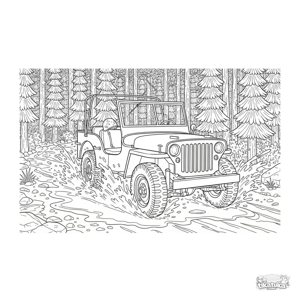 Página detalhada para colorir para meninos de 7-12 anos: um jipe militar realista da Segunda Guerra numa estrada florestal lamacenta.