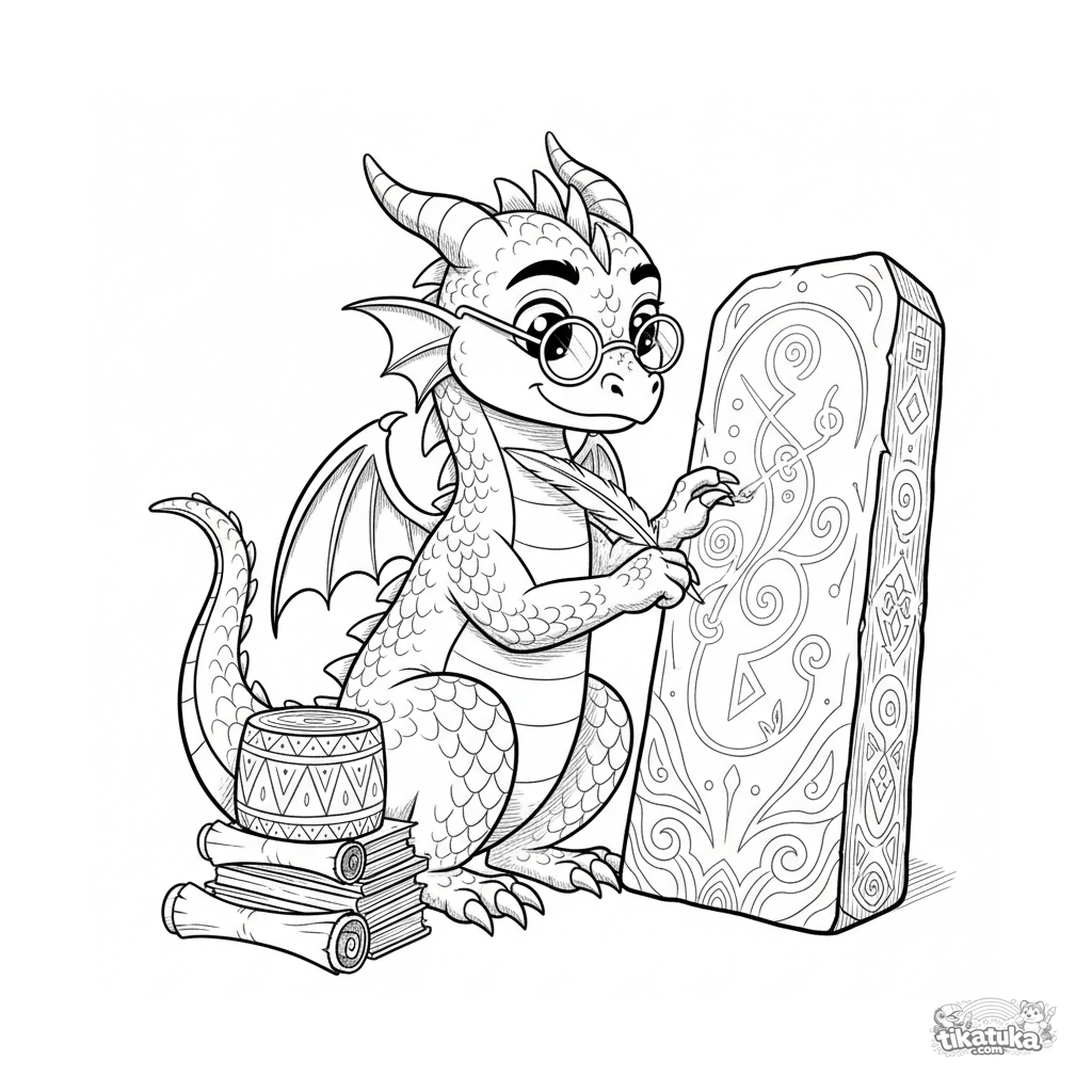 Página para colorir detalhada para crianças mais velhas de 10-12 anos: uma wyvern erudita de óculos estuda e traça runas antigas em um monólito. Muito detalhe, acessórios.