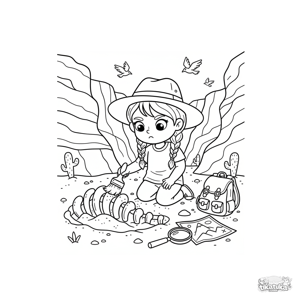Página para colorir para crianças 5-8: uma menina arqueóloga descobre cuidadosamente um osso de dinossauro em um cânion. Cena imaginativa para colorir.