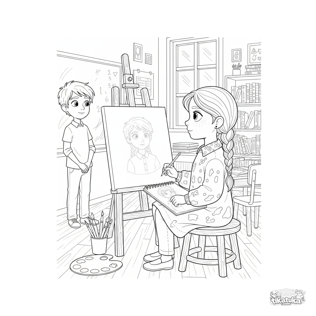 Página para colorir para crianças de 10-12 anos: uma jovem artista desenhando o retrato de um colega em um cavalete na sala de aula.
