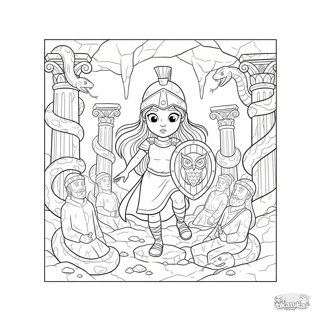 Página para colorir para crianças de 7-9 anos: uma jovem guerreira no covil da Medusa Górgona. Cena com estátuas de pedra e colunas, cheia de atmosfera misteriosa do mito antigo.