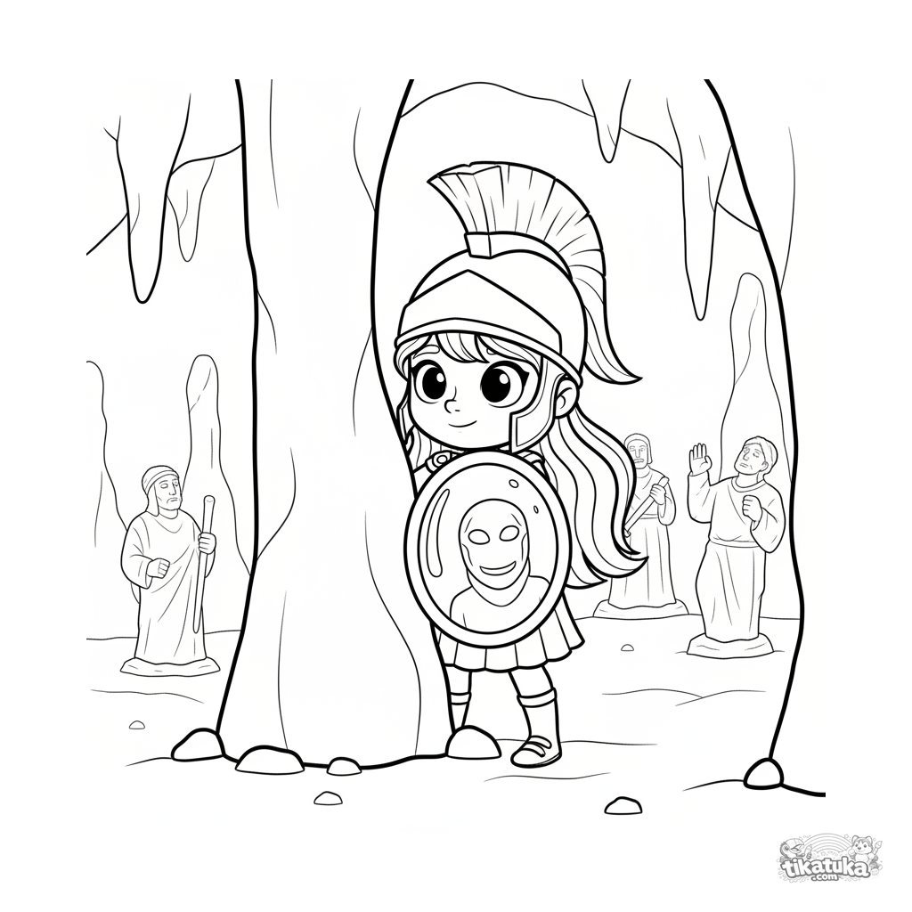 Página para colorir para crianças de 7-9 anos: uma jovem guerreira no covil da Górgona. Representada com um escudo entre estátuas de pedra.