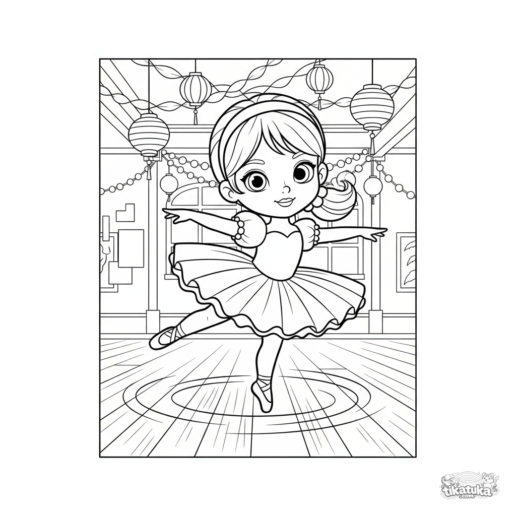 Página para colorir para crianças de 7-9 anos: uma jovem dançarina de tutu fofo pratica um giro em um salão festivo decorado com guirlandas.