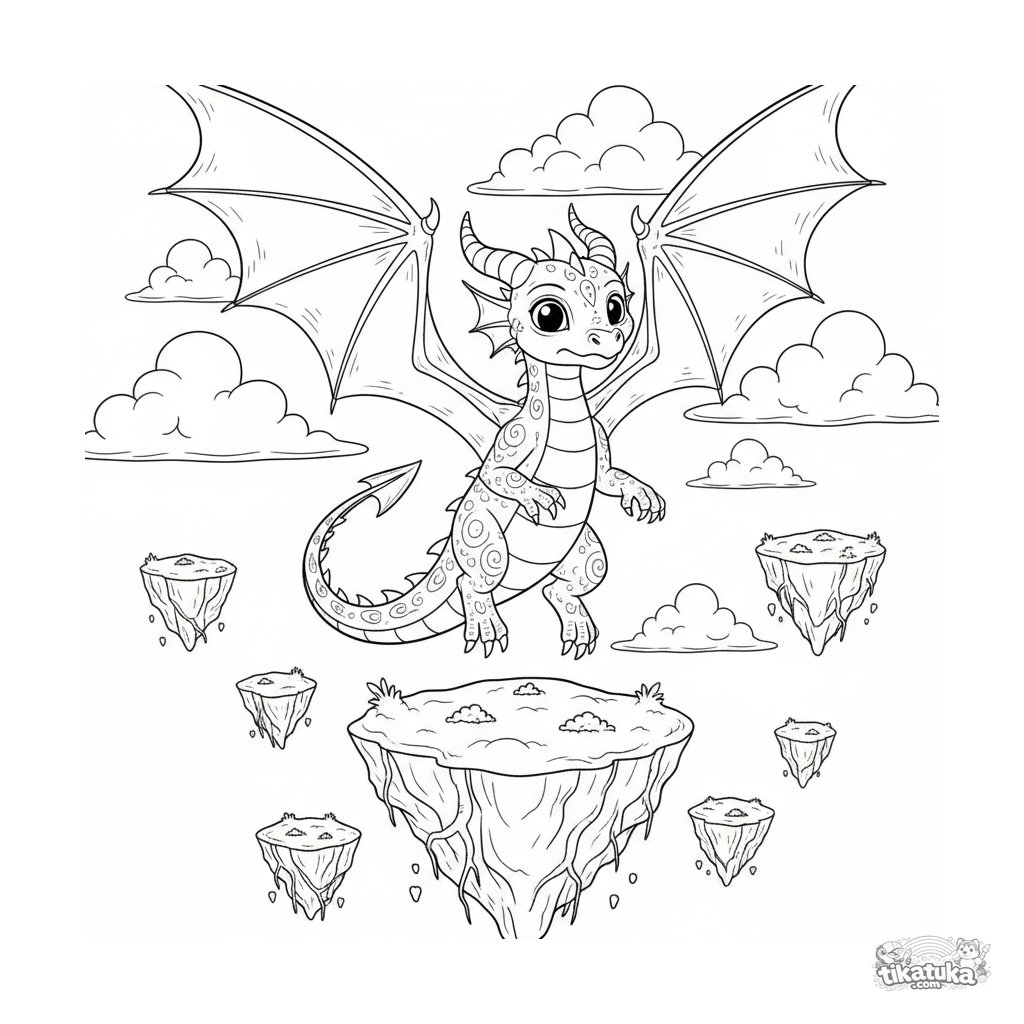 Página para colorir para crianças mais velhas 10-12: um dragão jovem com asas grandes aprendendo a voar sobre ilhas flutuantes cobertas de musgo. Cena de fantasia detalhada.