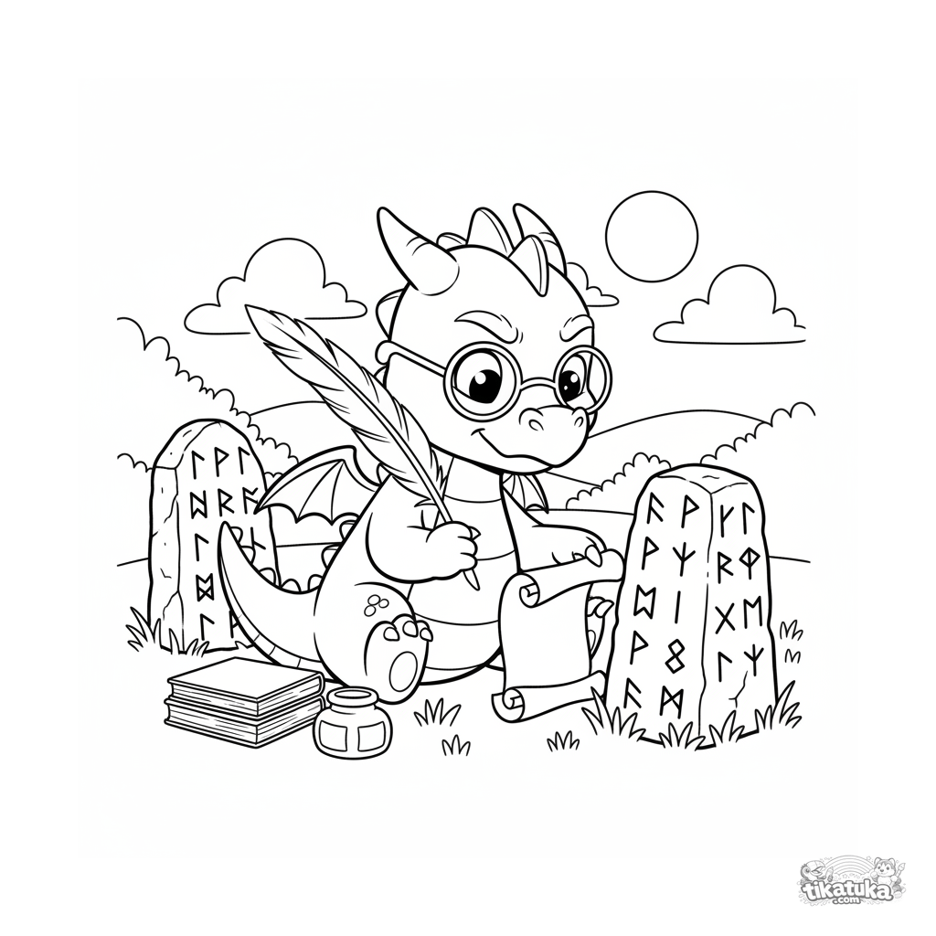 Página para colorir para crianças de 7-9 anos: um jovem dragão erudito com óculos copia diligentemente runas antigas de um monólito para um pergaminho. Cena com um clima histórico.