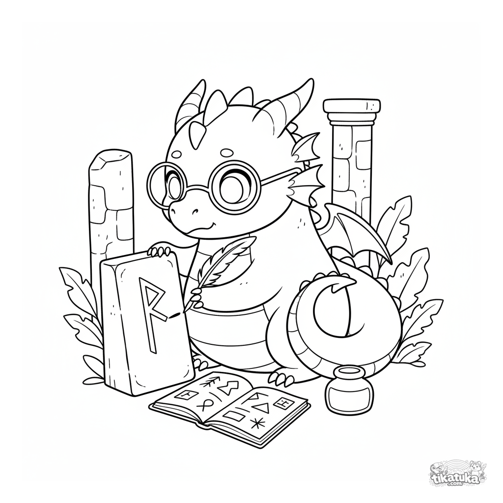 Página para colorir para pré-adolescentes 7-9: um jovem dragão escriba de óculos traça runas em um monólito antigo. Pergaminho e tinteiro por perto, detalhe moderado.