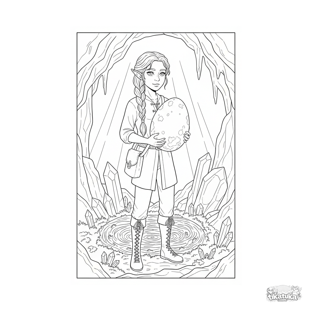 Página para colorir para 10-12 anos: um jovem elfo descobre um ovo de dragão brilhante em uma caverna de cristal. Cena detalhada para colorir criativamente.