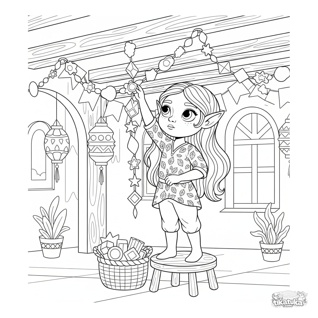 Página para colorir: uma elfa jovem decorando um salão festivo com uma guirlanda. Cena com detalhes para 7-9 anos, figura completa, margens amplas.