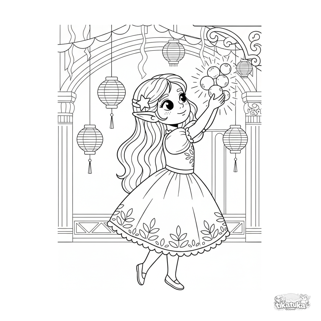 Página para colorir para meninas 7-9: uma menina elfa em um salão festivo organiza cuidadosamente orbes mágicos brilhantes. Cena com bandeirolas e serpentinas.
