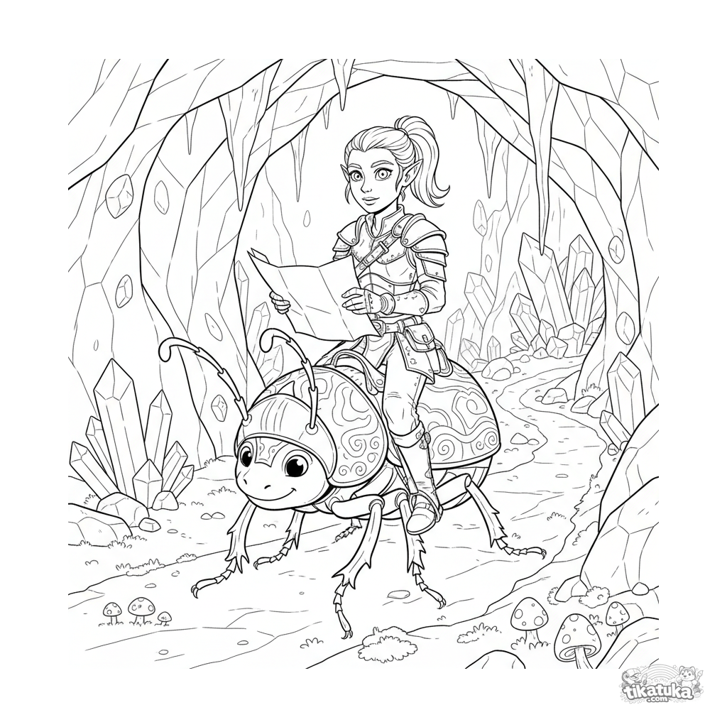 Página para colorir para 10-12 anos: um batedor elfo montando um besouro gigante explora uma caverna de cristal luminosa. Cena detalhada para amantes de fantasia.