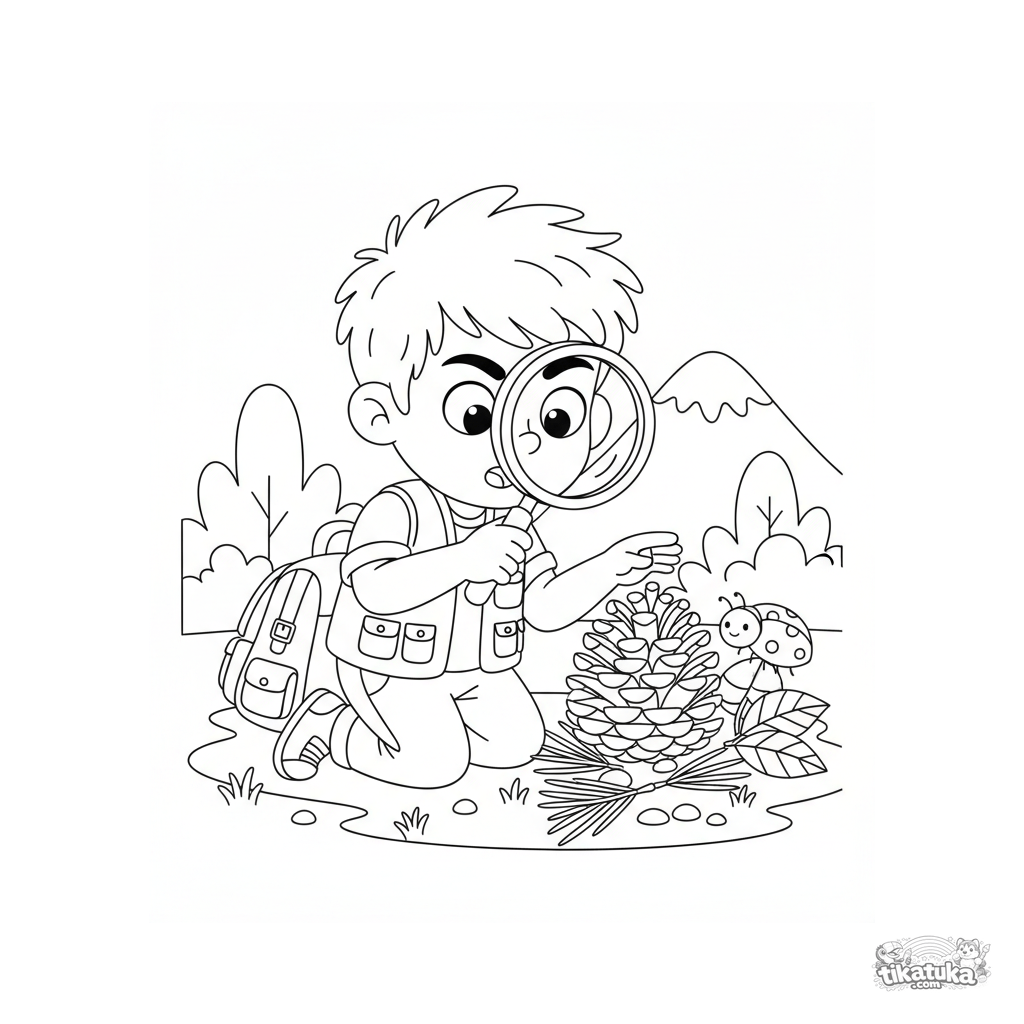 Página para colorir para meninos de 4-6 anos: um jovem explorador estuda uma pinha com uma lupa na floresta. Cena que incentiva a curiosidade.