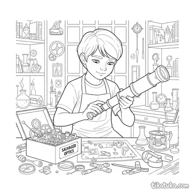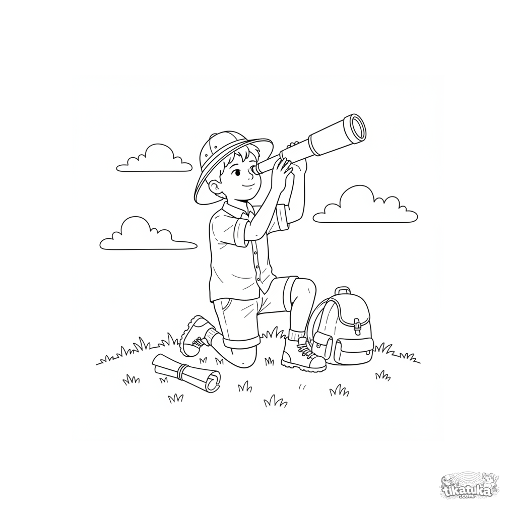 Página para colorir para meninos: um jovem explorador com telescópio no topo de uma colina. Para 5-7 anos. Detalhes: mapa, mochila, nuvens. Estilo realista, bom para colorir.