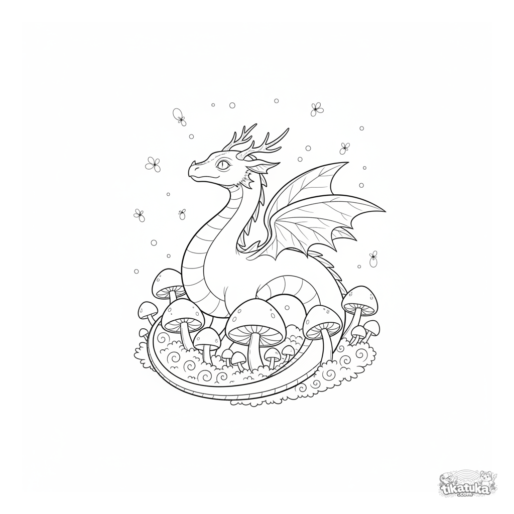 Página para colorir para crianças: um dragão fofo da floresta guardando um anel mágico de cogumelos brilhantes.