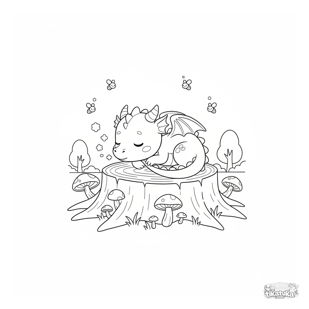 Página simples para colorir para crianças pequenas de 2-3 anos: um dragão fofo da floresta dorme num toco coberto de cogumelos. Formas grandes, contornos grossos, quase sem fundo.