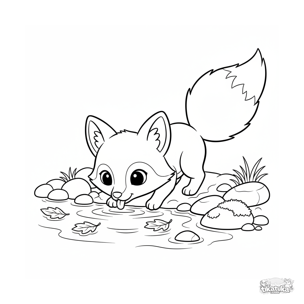 Página para colorir para 7-9 anos: um filhote de raposa bebe cuidadosamente de um riacho no outono. Cena no estilo clássico da Disney.
