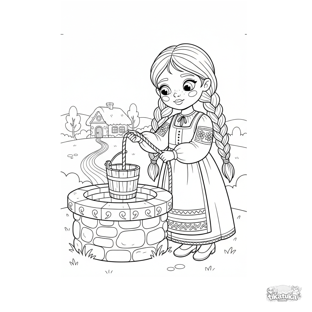 Página para colorir para crianças 4-6: uma menina com vestido tradicional tira água de um poço de água viva. Cena no estilo lubok folclórico.
