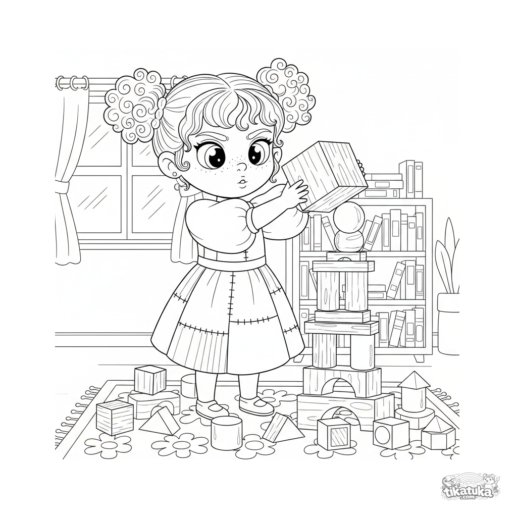 Página para colorir para crianças de 2-3 anos: uma menina de vestido constrói uma torre alta com blocos grandes. Formas simples perfeitas para mãozinhas.
