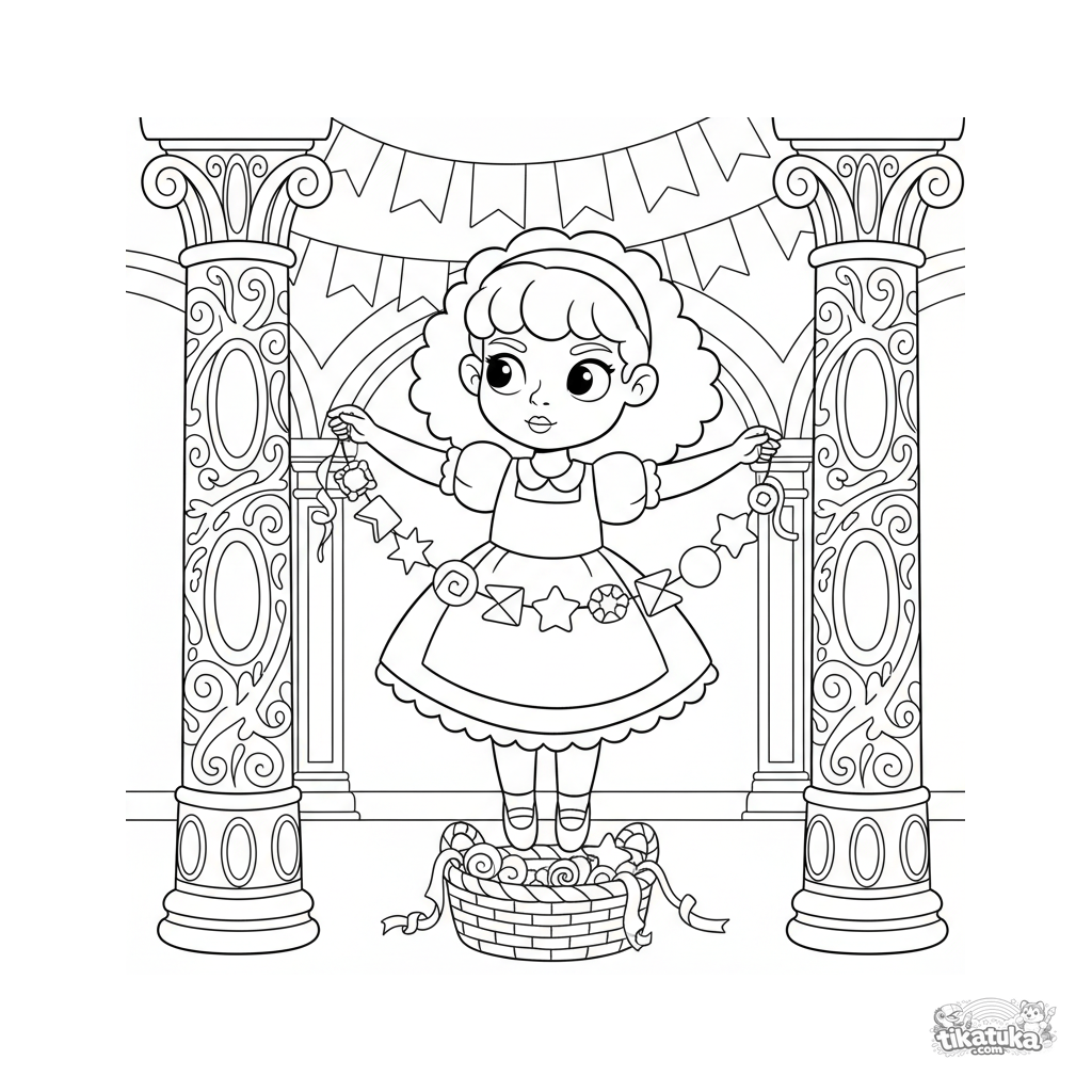 Página para colorir para crianças 4-6: uma menina decorando um salão festivo com guirlandas de papel. Cena de preparação de festa.