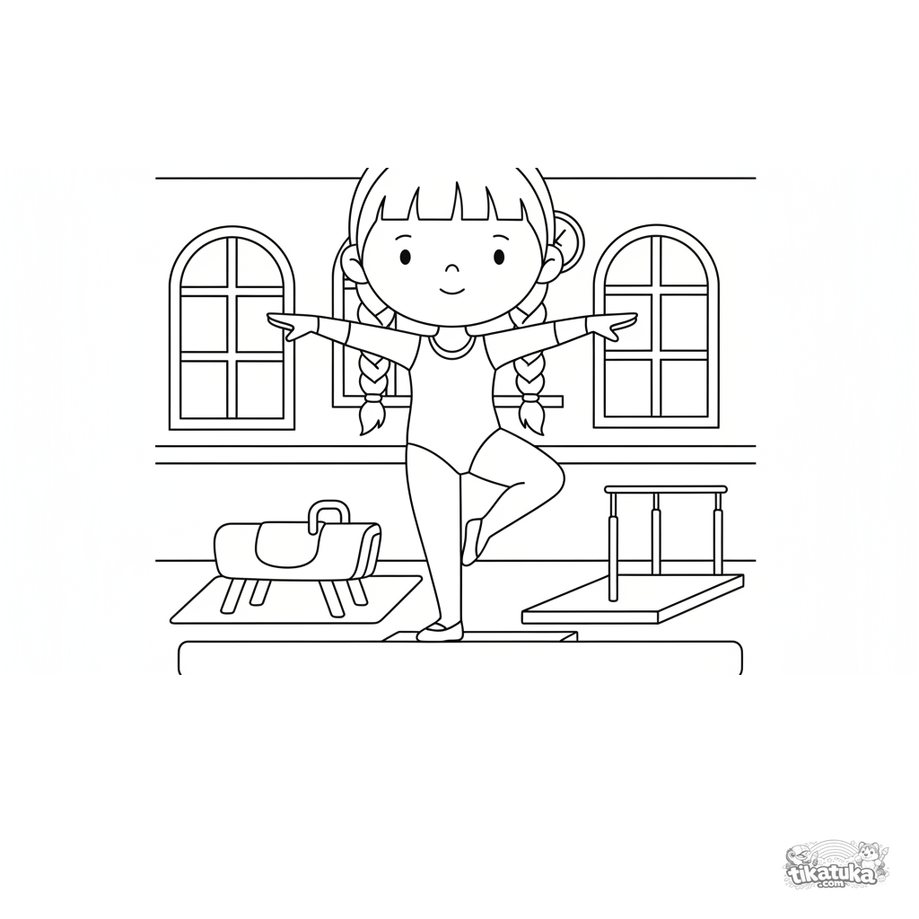 Página para colorir para crianças 4-6: uma jovem ginasta fazendo uma pose na trave de equilíbrio em um ginásio. Cena esportiva simples e elegante.