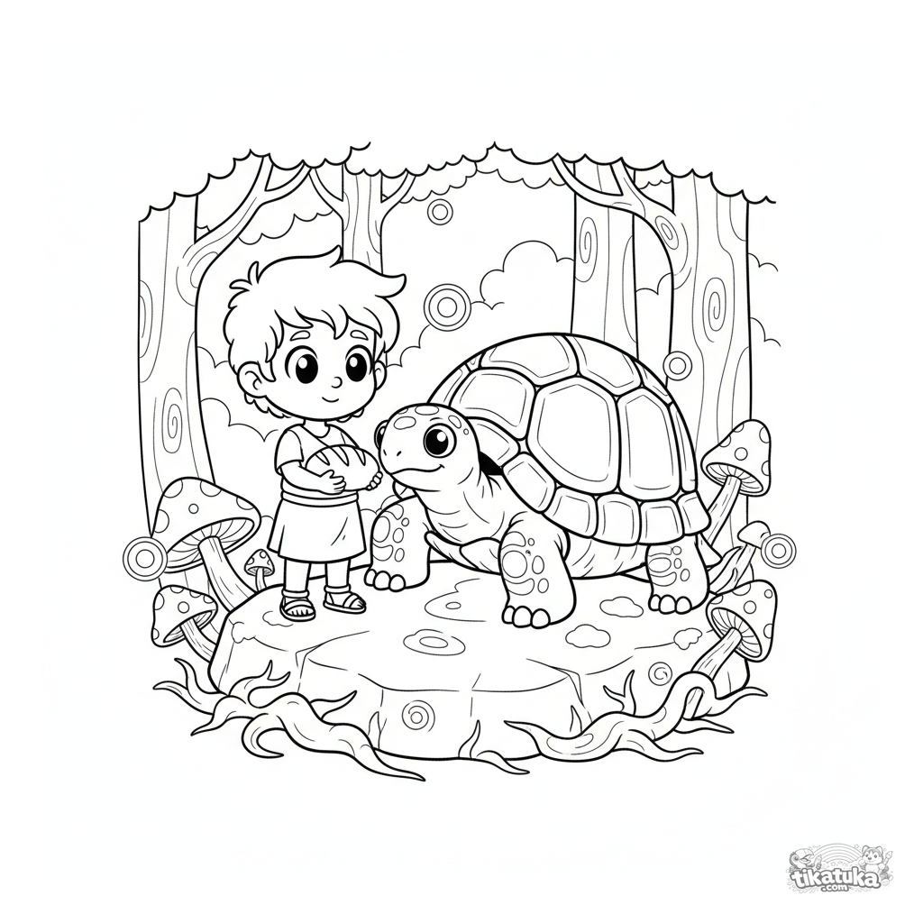 Página para colorir para crianças: um jovem herói oferece pão a uma tartaruga guardiã gigante em uma floresta antiga. Cena de amizade e ajuda de mitos.