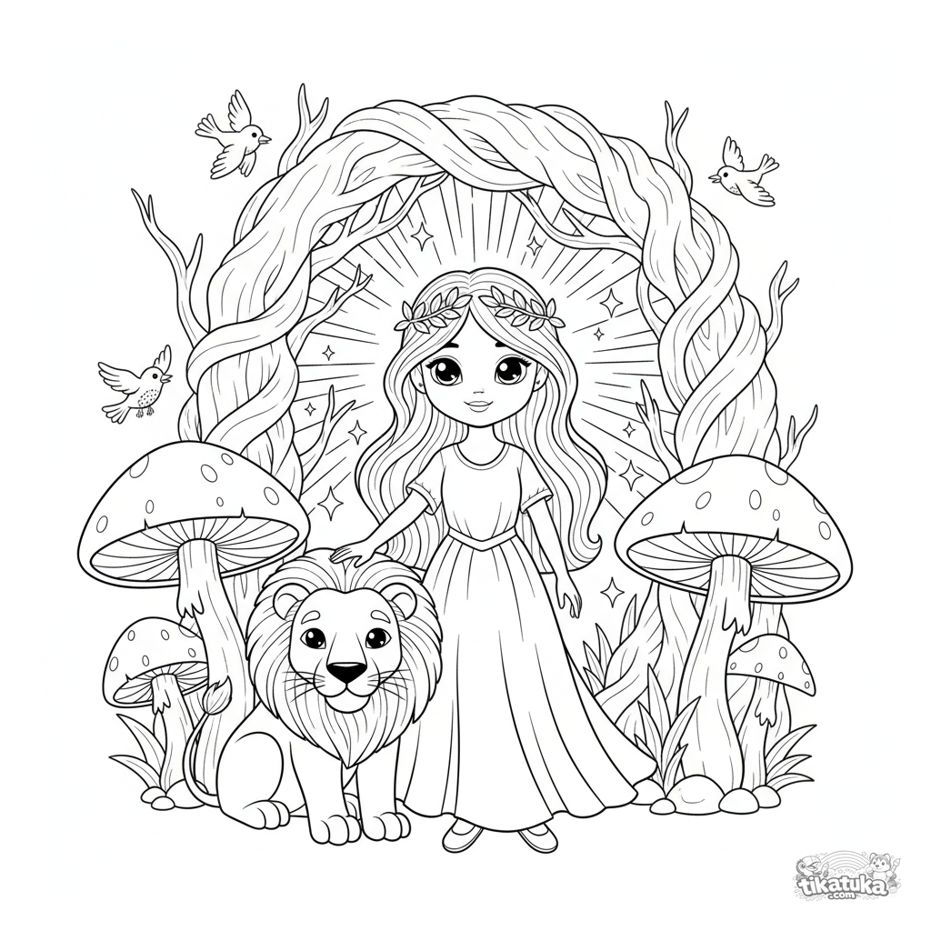 Página para colorir para crianças 4-6: uma jovem heroína guarda a entrada de uma floresta antiga mágica ao lado de um leão de pedra.