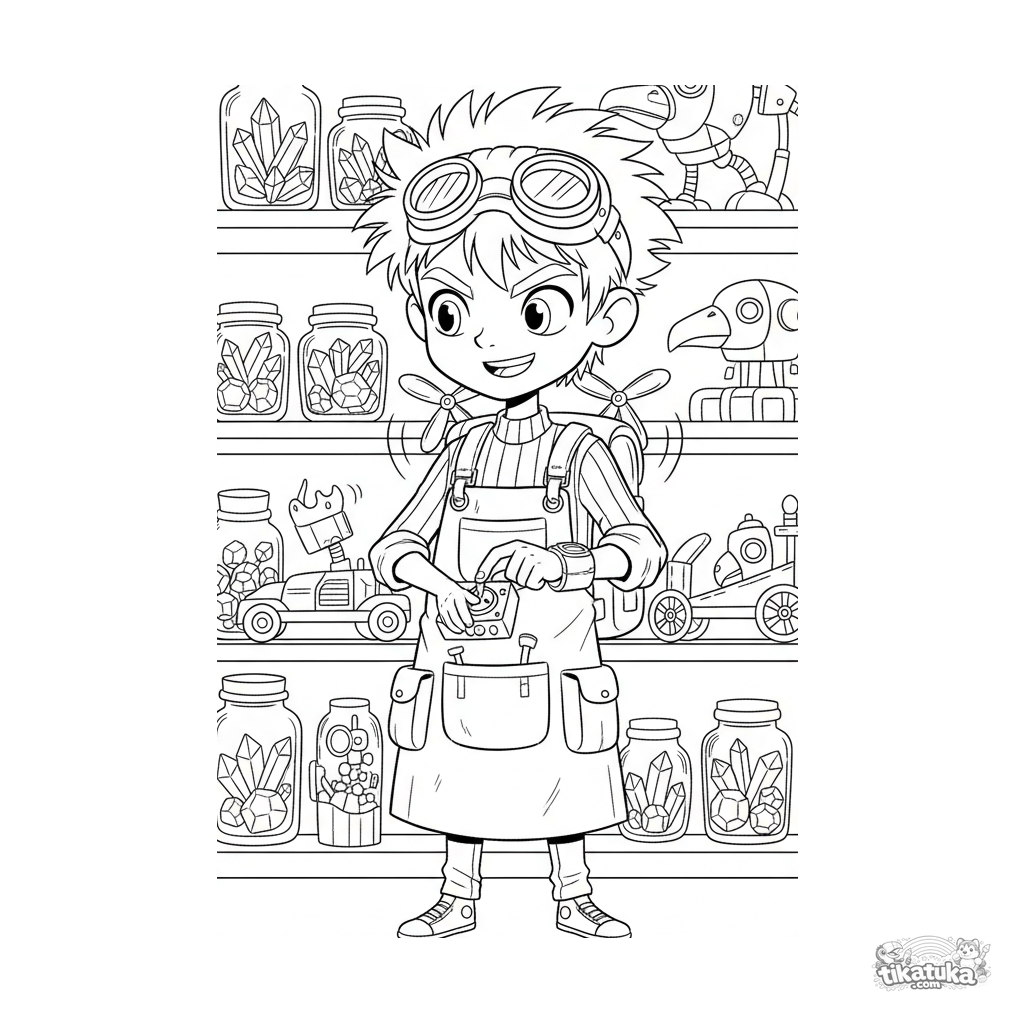 Página para colorir para crianças 7-9: um jovem inventor em um laboratório secreto testando seus óculos voadores e mochila mecânica.